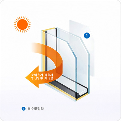 우수한 단열성능으로 냉 · 난방 에너지 절감의 효과가 있는 단열유리입니다.