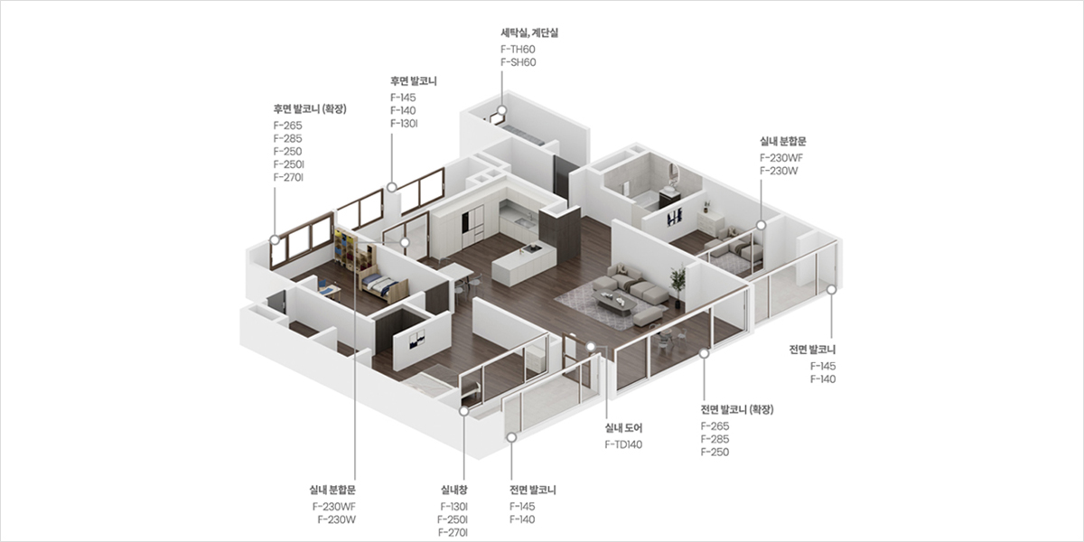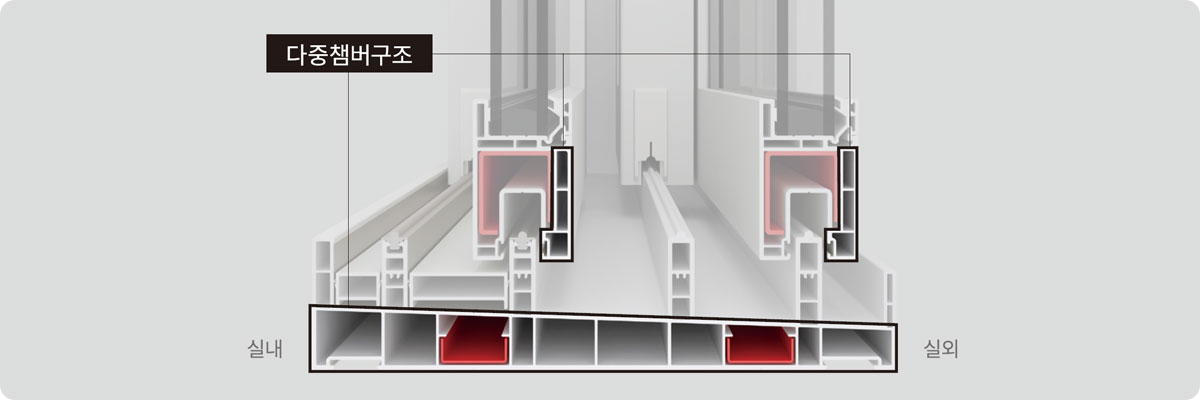 창짝, 창틀 내부에 여러 겹의 공간(다중챔버)이 공기층을 형성하여 외부의 냉기 유입을 최소화합니다.